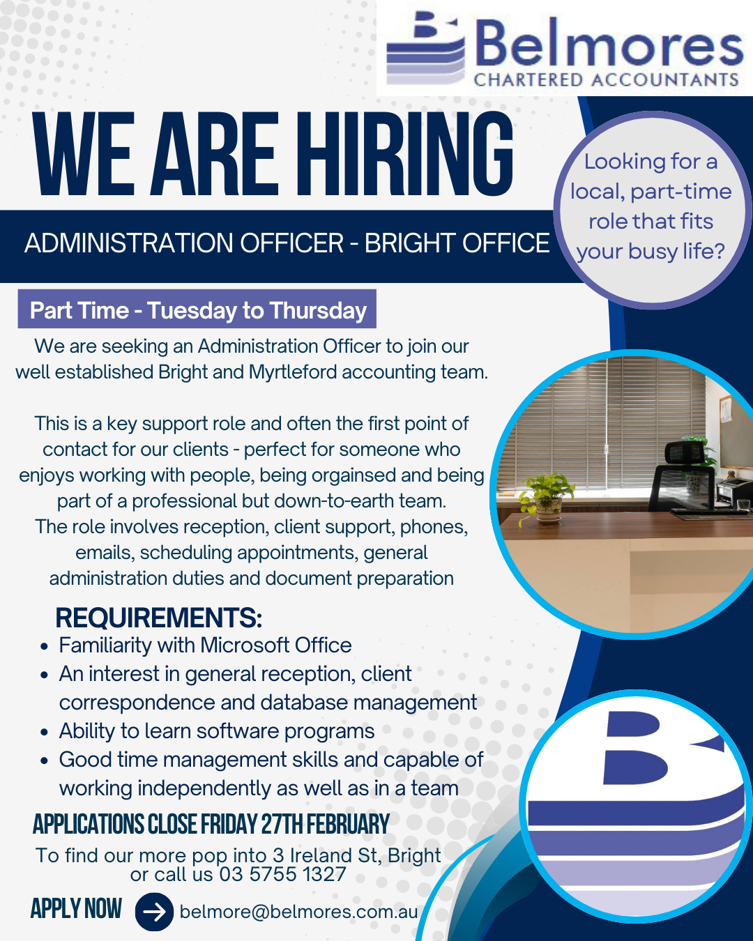We have an opportunity for a friendly and well orgainsed administration assistant to join our team in our Bright Accounting office.
