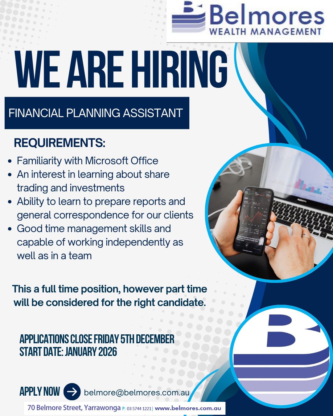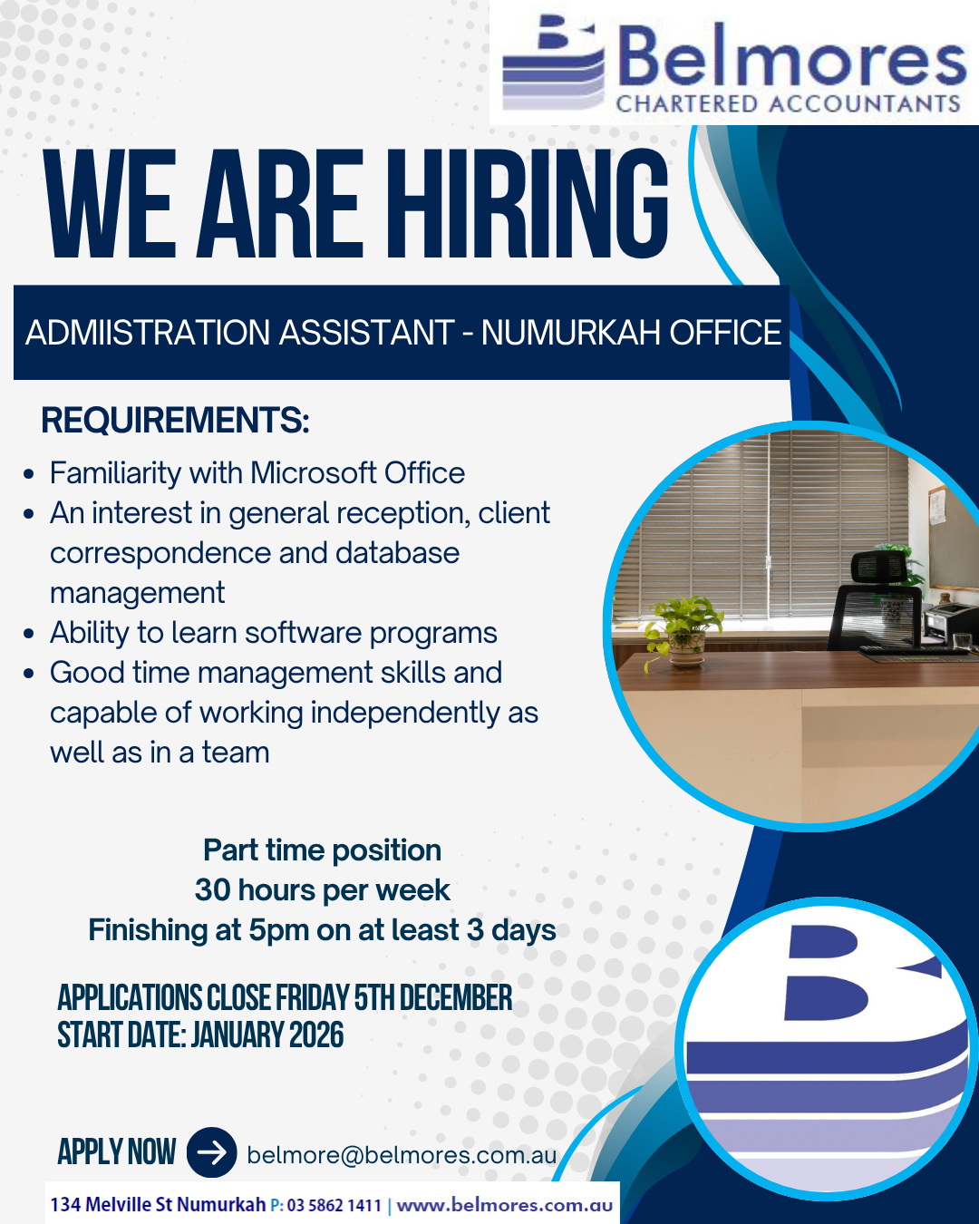 We have two opportunities to join our team in our Numurkah Accounting office and Yarrawonga Financial Planning office.